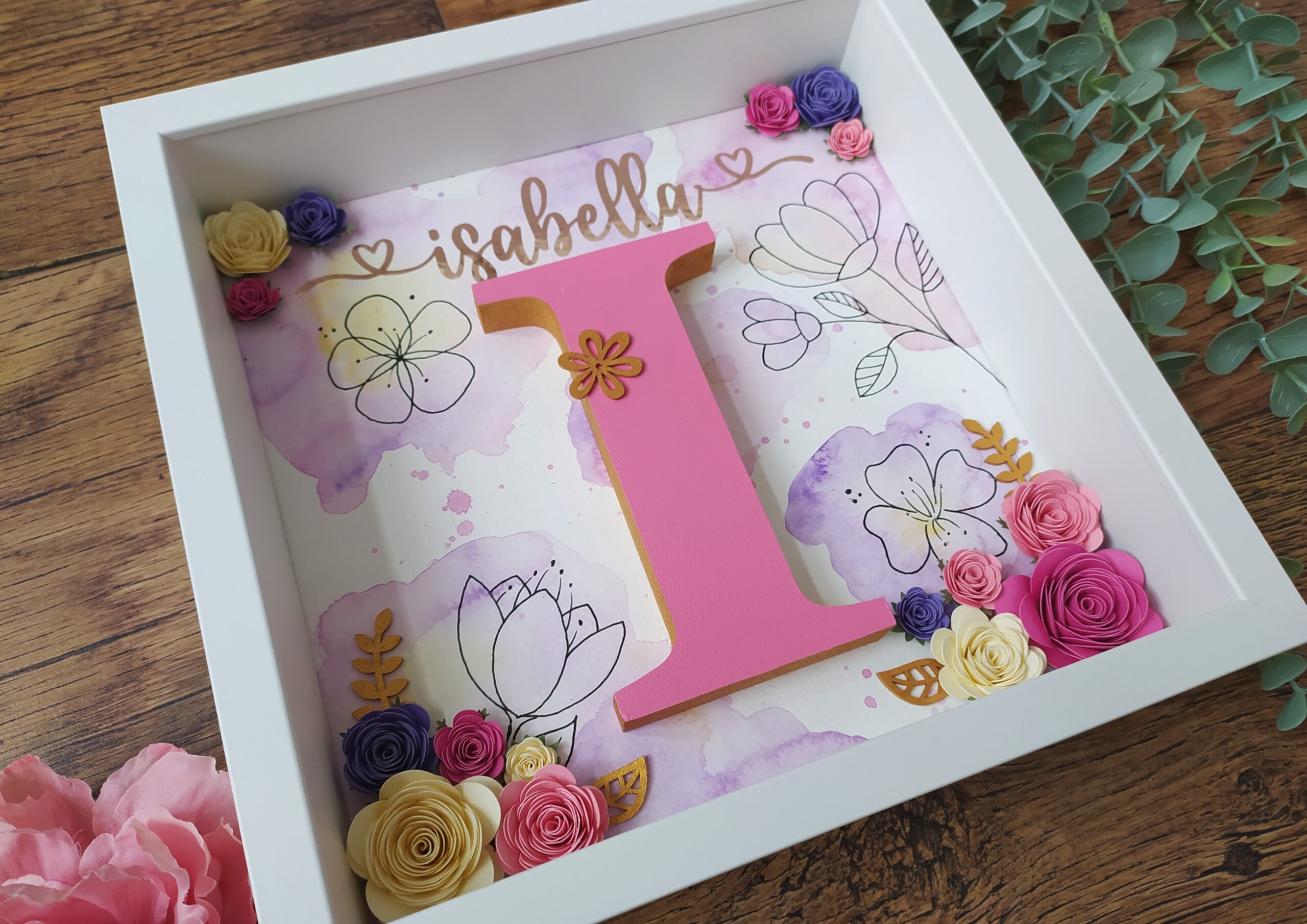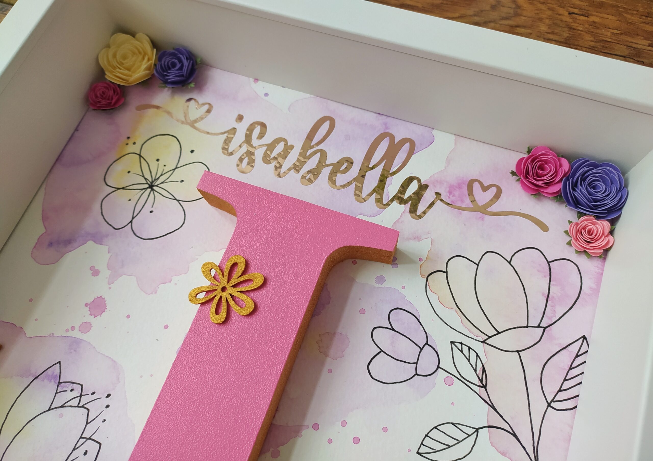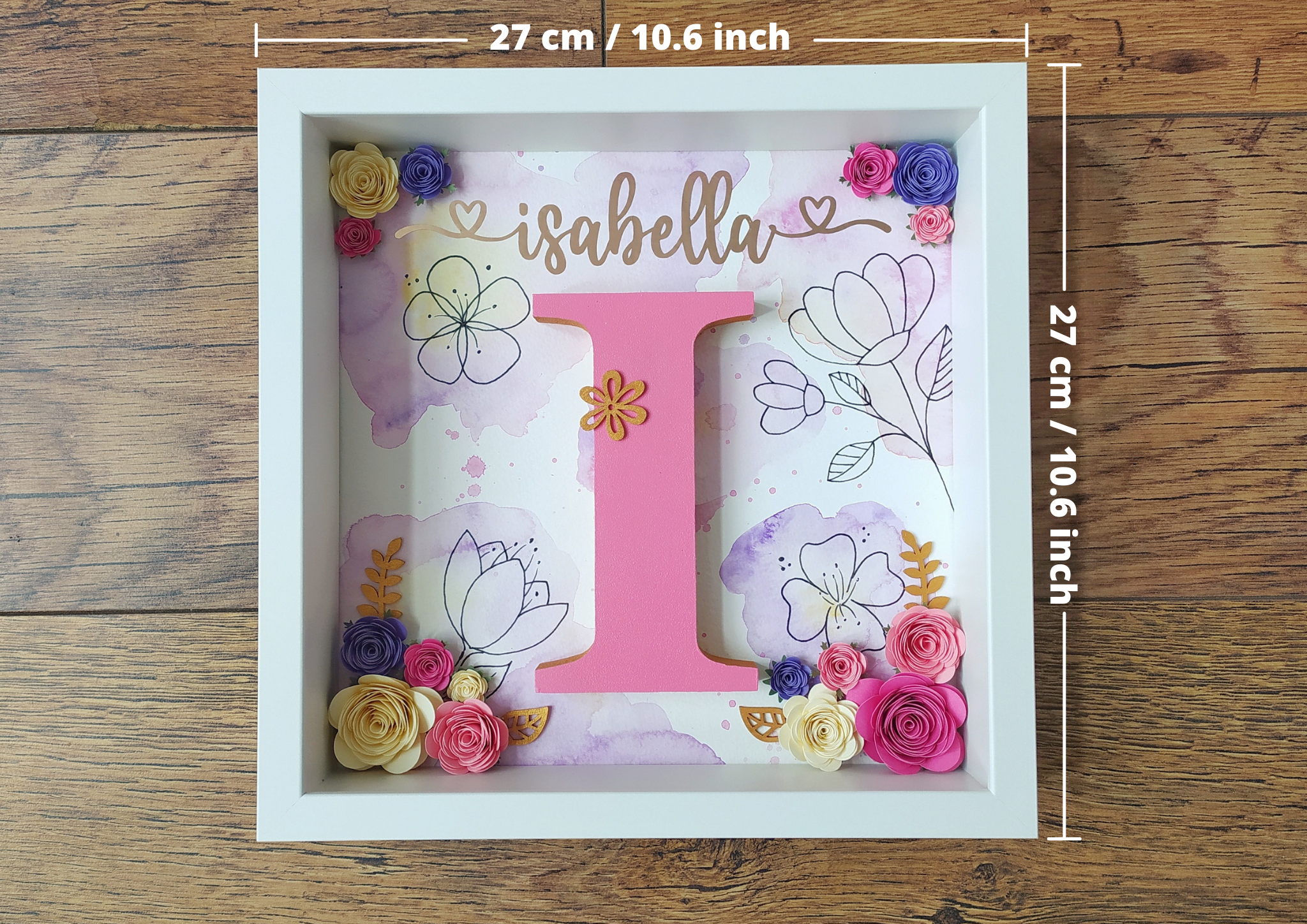 Your chosen letter will be beautifully framed and decorated with golden edges. You can select the colour of the wooden letter, and we will personalise it with the name of your choice in stunning golden colour.